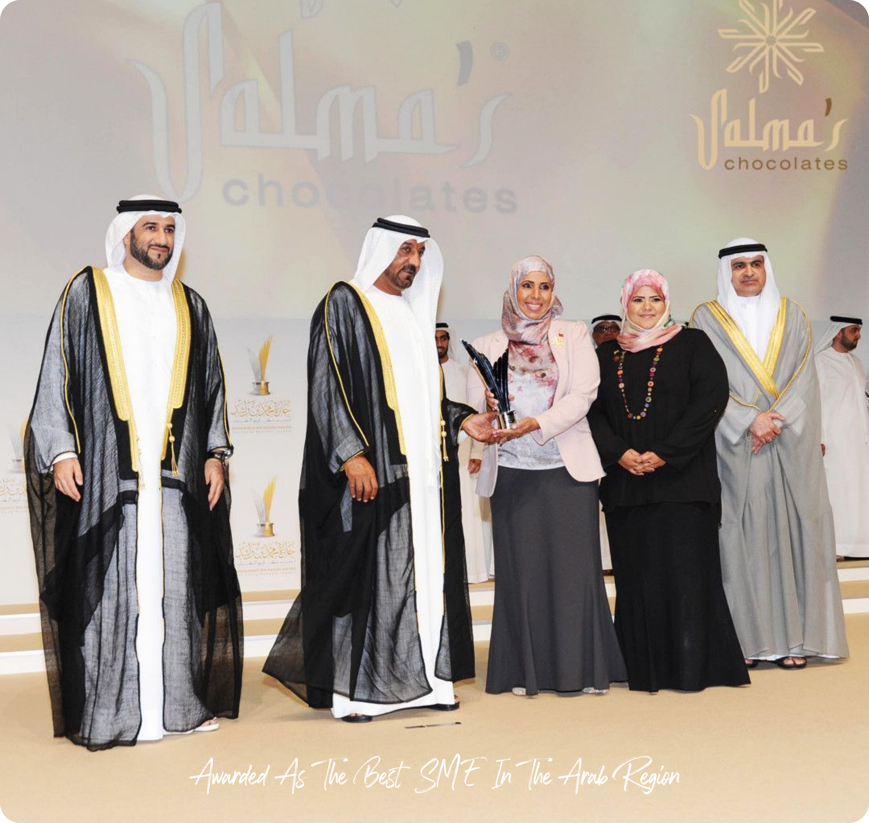 حصلت شركة سلمى للشوكولاتة بكل فخر على جائزة مرموقة كأفضل شركة صغيرة ومتوسطة الحجم في المنطقة العربية في حفل توزيع جوائز مميز أقيم في دبي عام 2015. وقد قدم صاحب السمو الشيخ راشد آل مكتوم هذه الجائزة، وهي شهادة على التميز والابتكار والالتزام بالجودة التي تميز علامتنا التجارية. تمثل هذه الجائزة علامة فارقة مهمة في رحلتنا، وتسلط الضوء على تفانينا الثابت في تقديم منتجات وخدمات استثنائية في صناعة الشوكولاتة شديدة التنافسية.